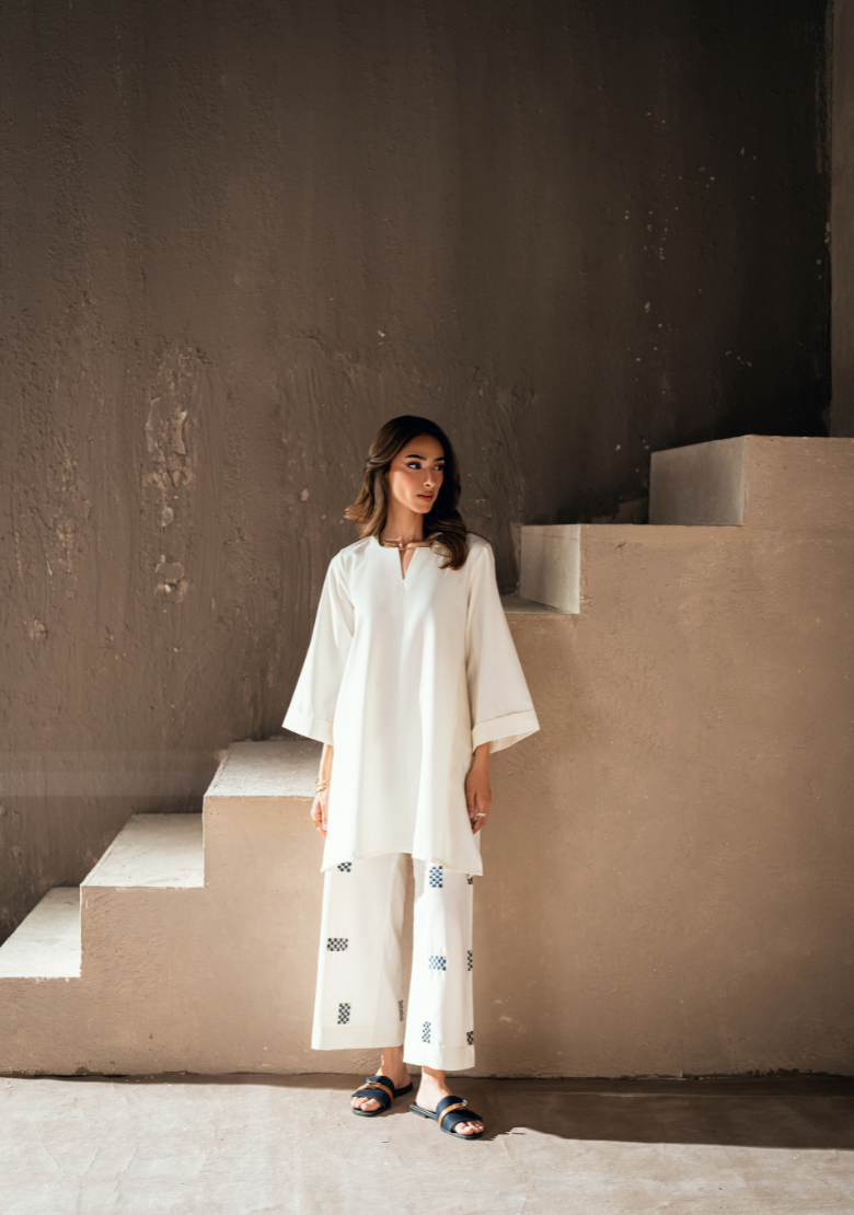 Embroidered butter-cream set Includes an embroidered shirt and shalwar Includes an attached lining Fabric - Pure premium cotton with a subtle sheen produced in-house Silk dupatta is sold separately  *The model is wearing a size XS *The colour of the article might vary...