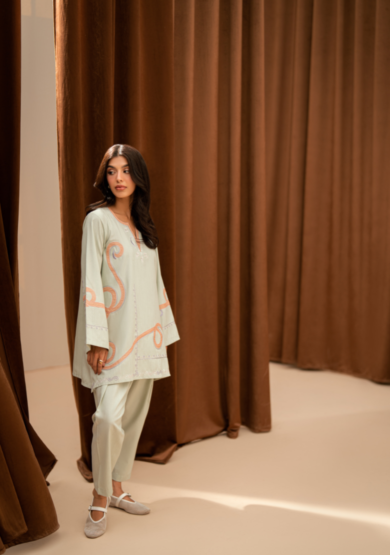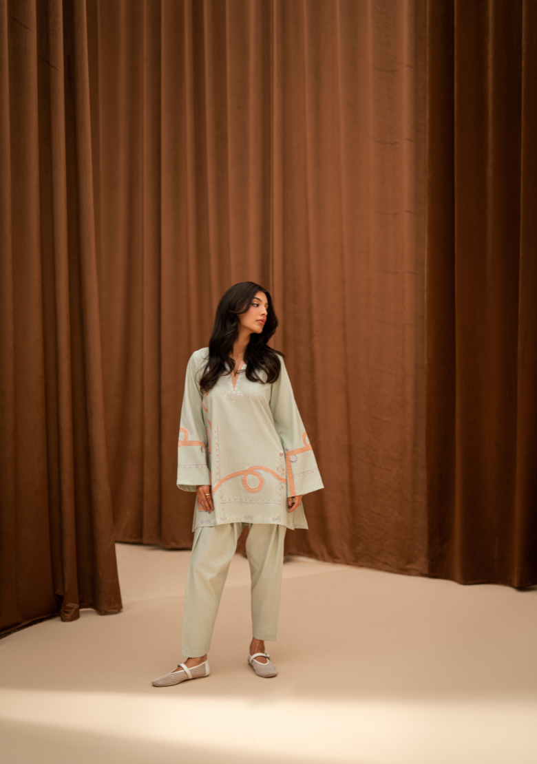 Embroidered butter-cream set Includes an embroidered shirt and shalwar Includes an attached lining Fabric - Pure premium cotton with a subtle sheen produced in-house Silk dupatta is sold separately *The model is wearing a size XS *The colour of the article might vary...